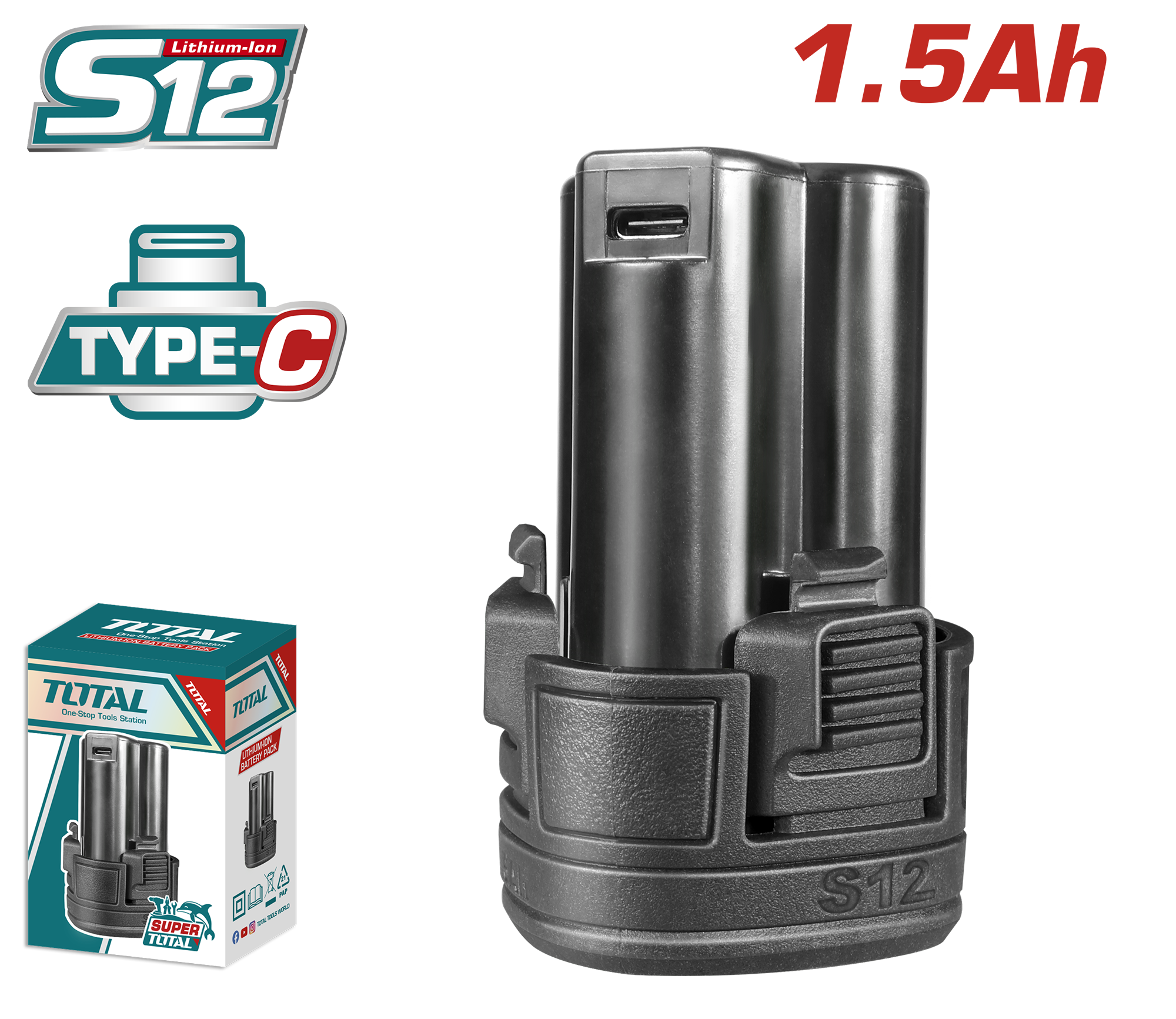 Điện thế: 12V. Pin Lithium-Ion 1.5Ah. Cổng sạc: USB loại C