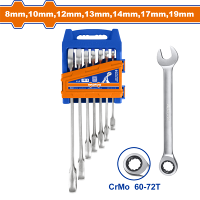 Bộ 7 cờ lê miệng vòng xoay chiều 8-19mm Đầu vặn Cr-Mo chất lượng cao Kích thước:8-19mm 8mm,10mm,12mm,13mm,14mm,17mm,19mm Mạ bóng đẹp, CR-V. Đóng gói bằng móc nhựa